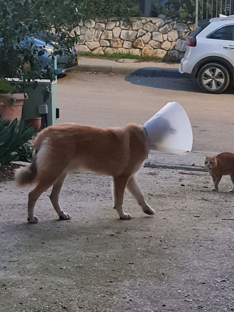 כלב עם קולר אליזבט, משוטט מהבוקר,מחפש אוכל. ש ...