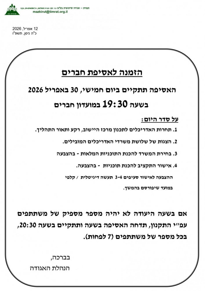 תזכורת - הזמנה למפגש הסברה ואסיפת חברים - תוכנית מרכז היישוב